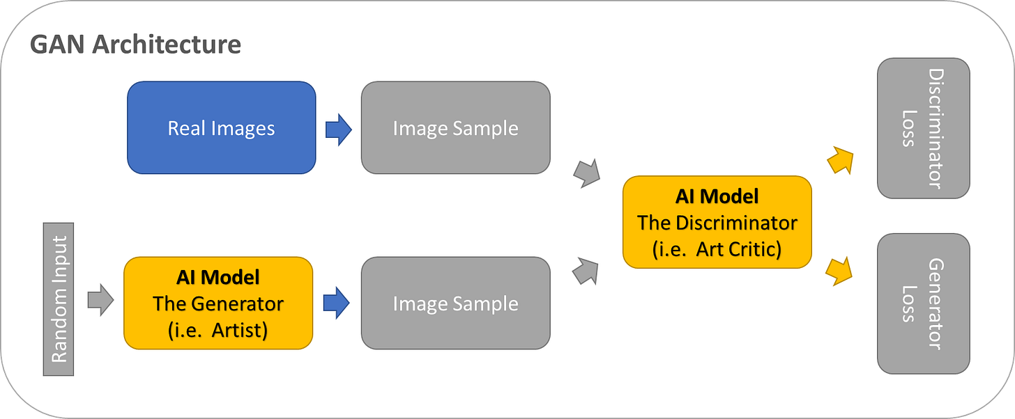 GAN, the backstory - Ian contemplated the implications of having two AI models trying to outcompete one another. What if, AI Model #1 generates fake images as AI model #2 is fed both fake images and real images and tries to distinguish if AI Model #1 images are real or fake. He likened it to an artist and an art critic, each trying to outduel each other, the artist showing generated images which he’s trying to pass off as real images, while the art critic is fed both real and the artist fake images and tries to determine which one is real and which one is fake (generated).