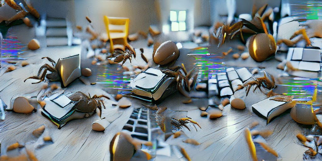 What is this creative chaos you ask? What if I told you an AI model generated this when I prompted it with the following text, “Computer code runs away from debugger chasing after it”.