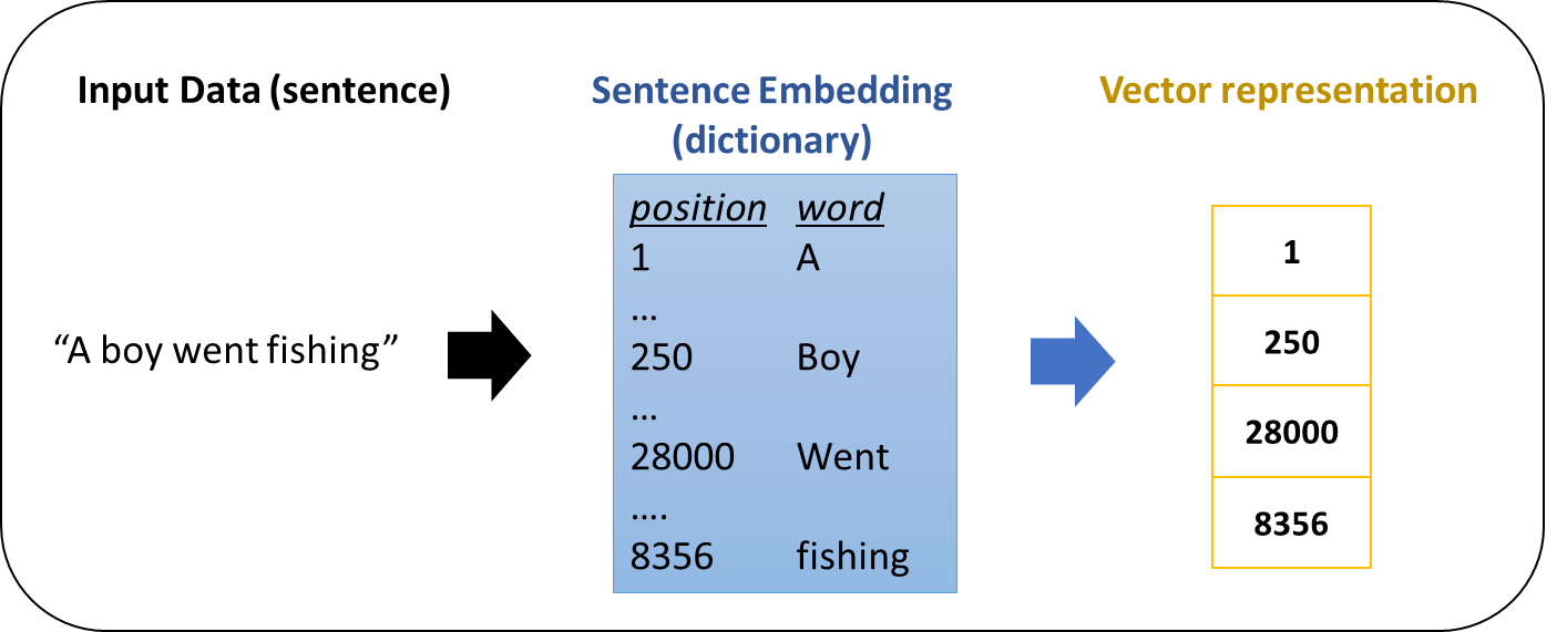An example, a word can be represented by it’s position in a dictionary, hence a sentence can be represented by a vector of word positions…
