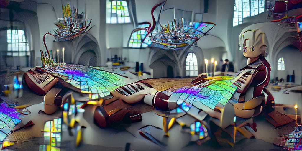 PROMPT: “Futuristic mozart composing a new digital symphony with a huge synthesizer made of stained glass and electricity”