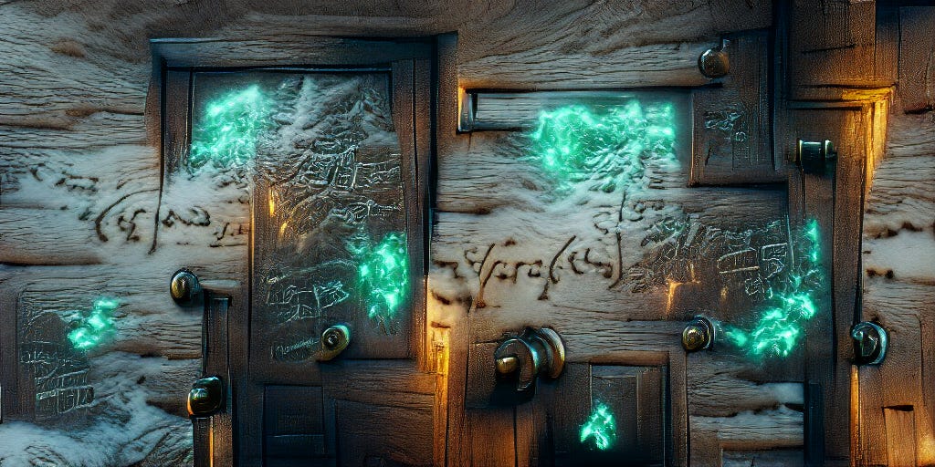 PROMPT: “During a snowstorm, etched into a mountainside, a large wooden door has Elvish letters etched in a magical emerald green glow | a map is also glowing etched into the door | rendered in Unreal Engine, v-ray”