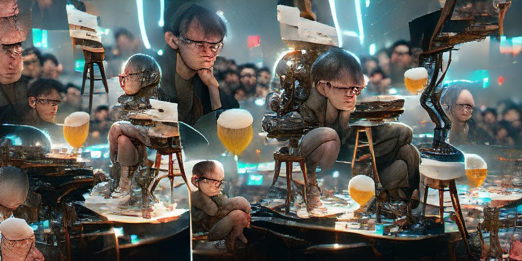 PROMPT: “Young AI researcher with glasses sitting on a bar stool drinking beers at a bar, thinking deeply of generative adversarial model architecture resembling an artist and an art critic”