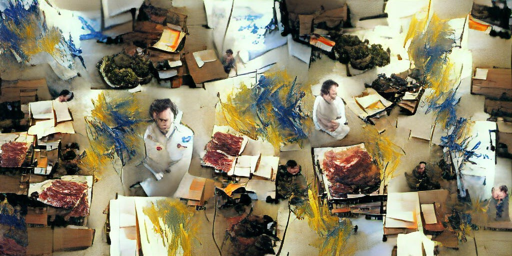 PROMPT: “Computer code runs away from debugger chasing after it” (VQGAN+CLIP), 1024x512, ~800 iterations