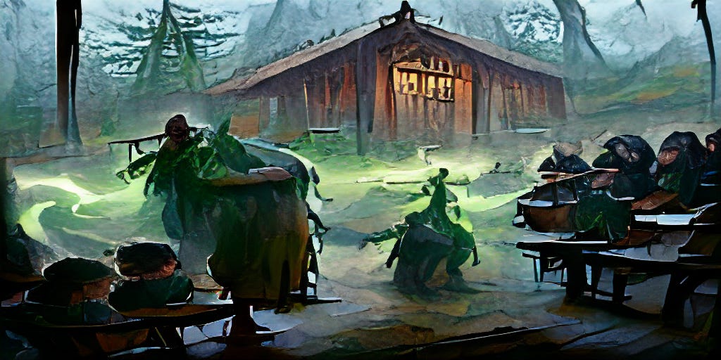 PROMPT: “An old elvish magician with mystical green robes teaches a classroom full of rowdy orc children students in a wood cabin schoolhouse early morning eerie fog, Greg Rutkowski James Gurney, Nicolas Pierquin artstation”