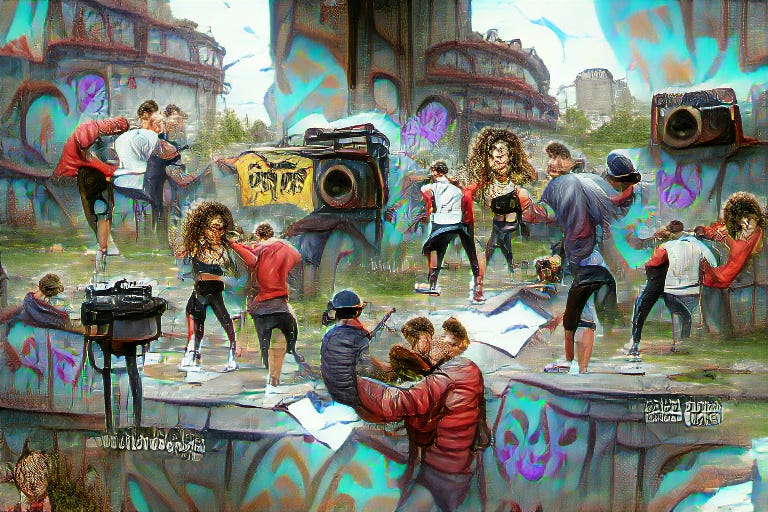 PROMPT: “Outdoor dance club covered in graffiti, smoky, break dancers, boombox, DJ, record players, microphone 80s hip hop”