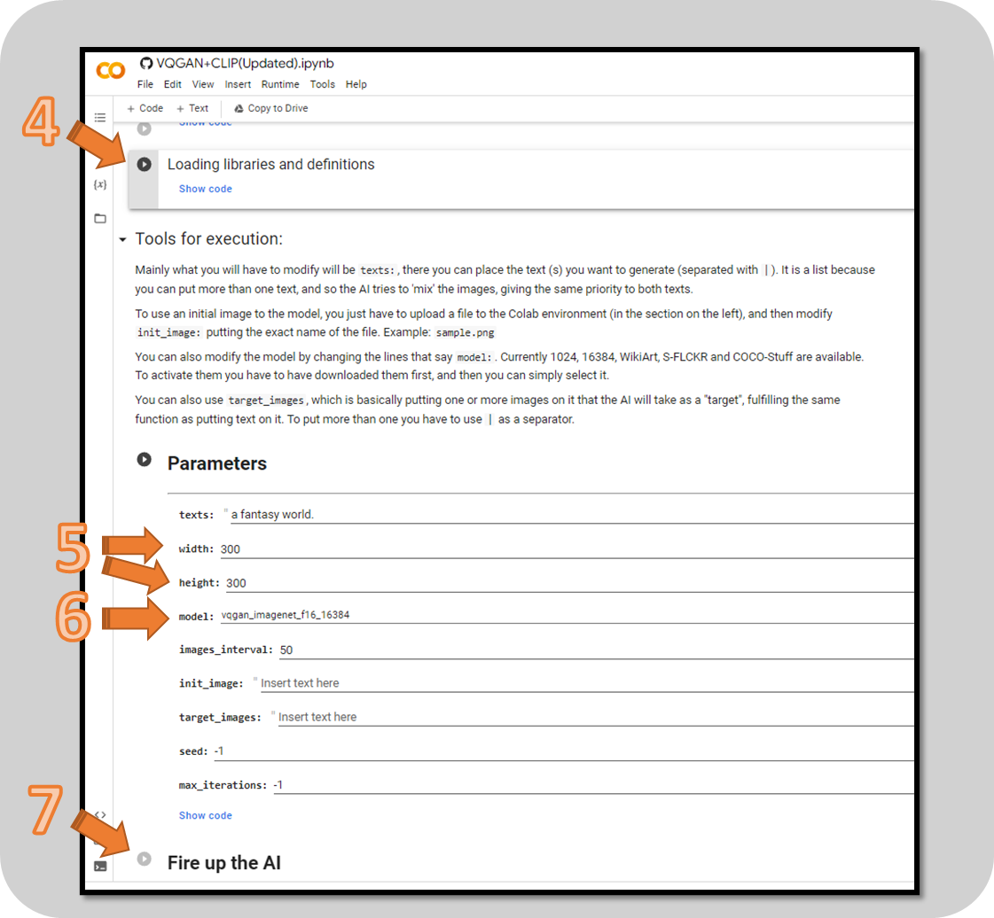 With notebooks, you need to run each block of code in sequence, by pressing the play buttons in the left hand side (see pic below). Click on the link to load up the notebook into your browser. Now follow the walkthrough to start generating images…