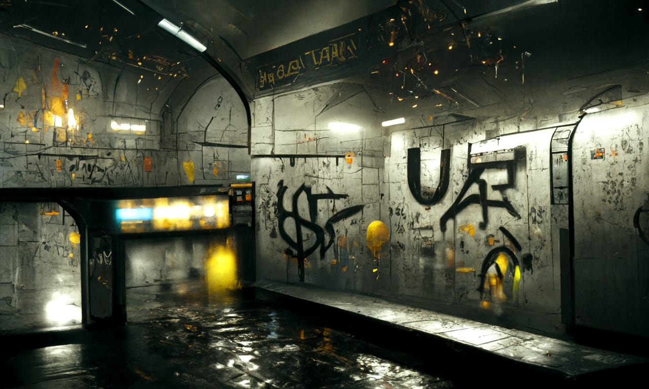 PROMPT: “Damp dark Underground subway station with walls covered in graffiti tatscru , train tracks disappear in distance, flickering broken lights and highly illuminated bitcoins radiating on the floor” - Disco Diffusion v5.2