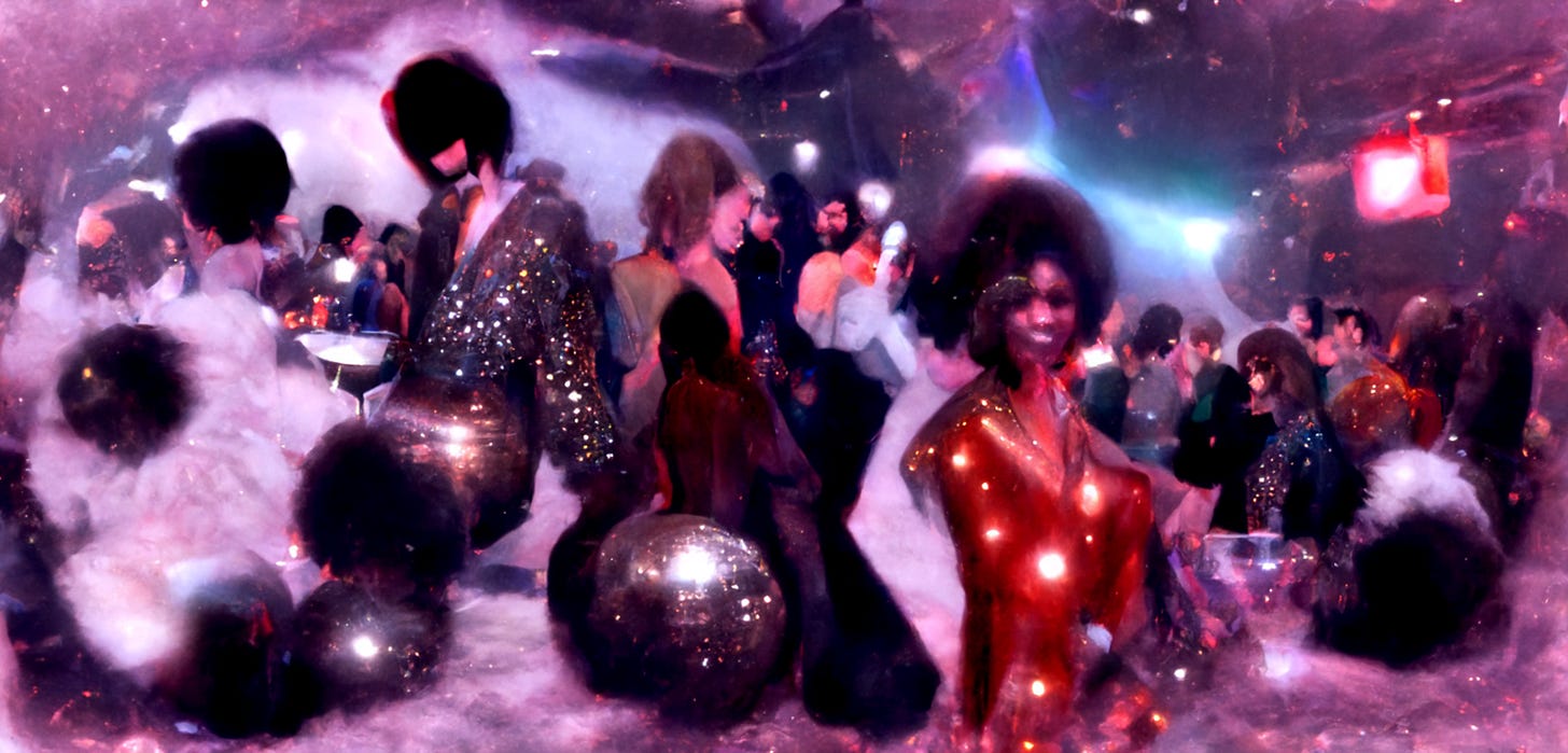 PROMPT: “Musicians and artists wearing sequins, velvet clothes, tight jumpsuits, furs, fluid satin dresses dancing Disco at Studio 54 in late 70s New York City, disco balls, bar tables with champagne glasses | render in vintage photo 70s style” using Disco Diffusion v5.2