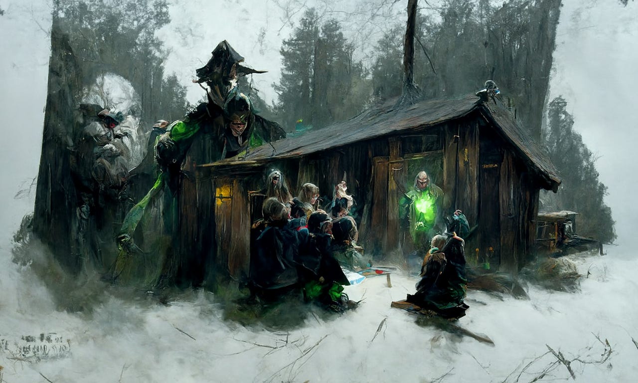 PROMPT: “An old elvish magician with mystical green robes teaches a classroom full of rowdy orc children students in a wood cabin schoolhouse early morning eerie fog, Greg Rutkowski James Gurney, Nicolas Pierquin artstation” - Disco Diffusion v5.2