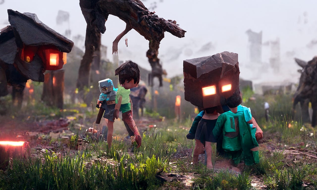 PROMPT: “Kids living in a Minecraft world full of Creepers, zombies, farm animals and blue diamond swords | render in Unreal Engine” - Disco Diffusion v5.2