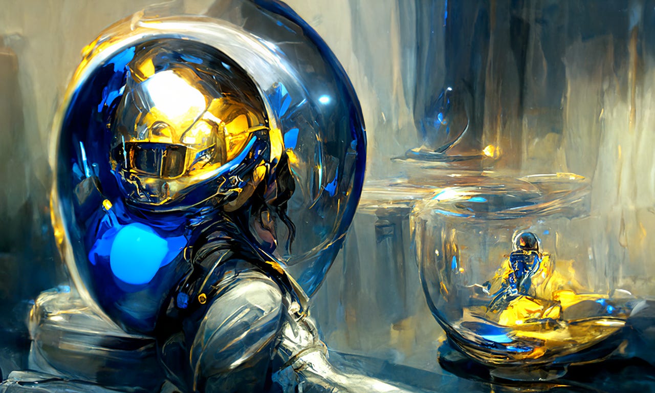 PROMPT: “Woman in futuristic spacesuit staring illuminating discovery in a crystal ball | metallic yellow blue color style” - Disco Diffusion v4.1